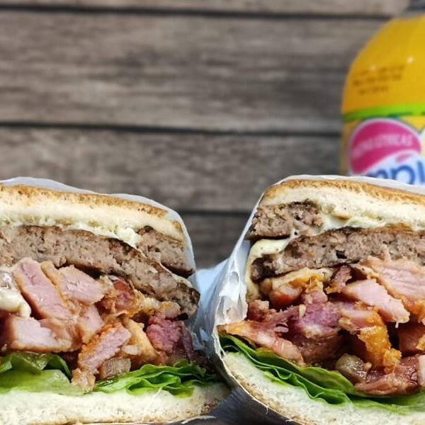 Pão,maionese,2hamburguer,mussarela,bacon,ovo,presunto,milho,batata palha,tomate,alface.