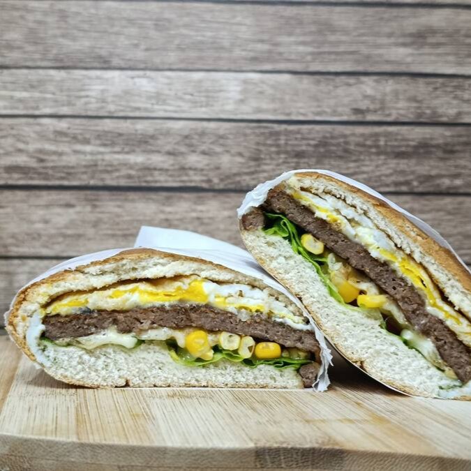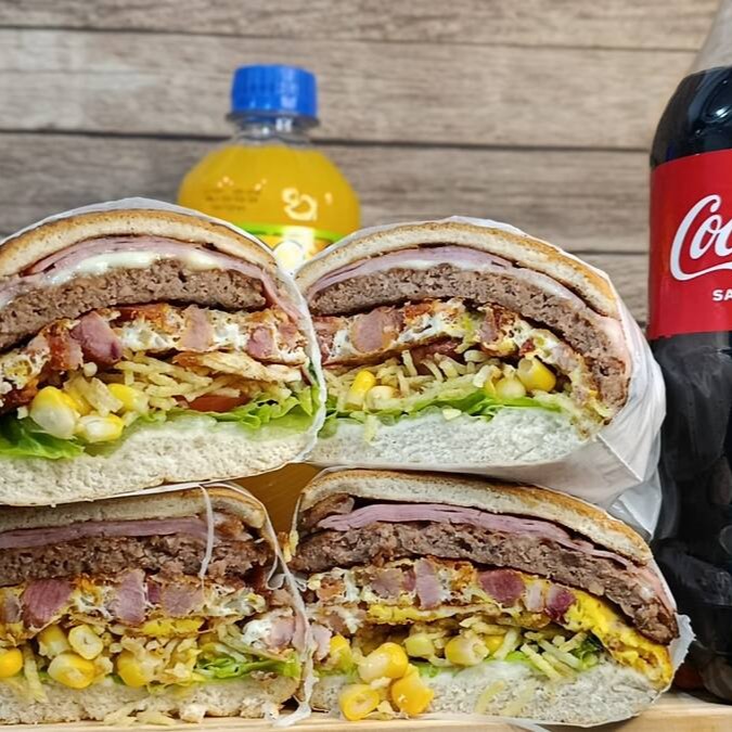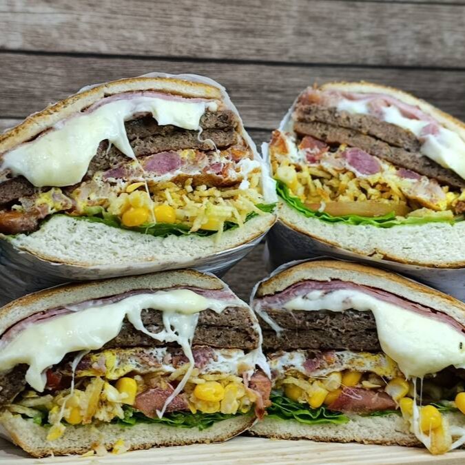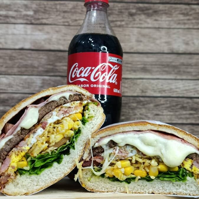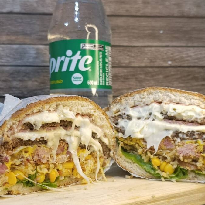 Pão,maionese,2 hamburguer,mussarela,ovo,milho,tomate,alface.