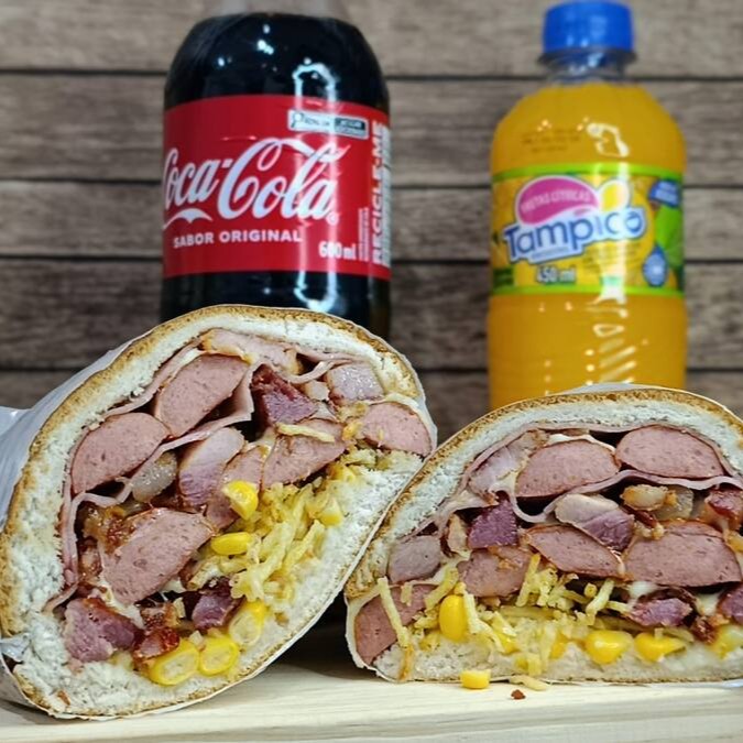 Pão,maionese,2hamburguer,mussarela,bacon,ovo,presunto,Catupiry,milho,batata palha,tomate,alface.