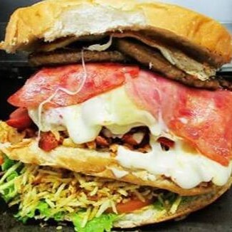 Hambúrguer,bacon,presunto, mussarela,ovo,alface,tomate e milho