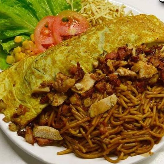 Macarrão, frango,bacon.omelete de presunto, mussarela, Catupiry,milho,batata palha