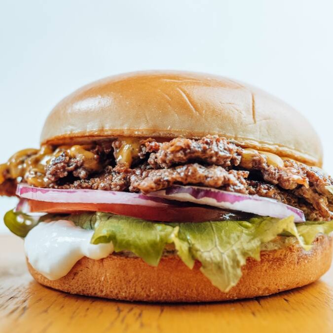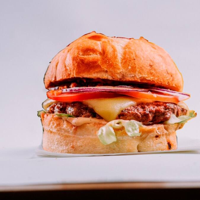 Pao De Smash, 2 Burger Amassados De 50gr Cada, Maionese Da Casa, Queijo Cheddar, Alface, Tomate, Cebola Roxa.