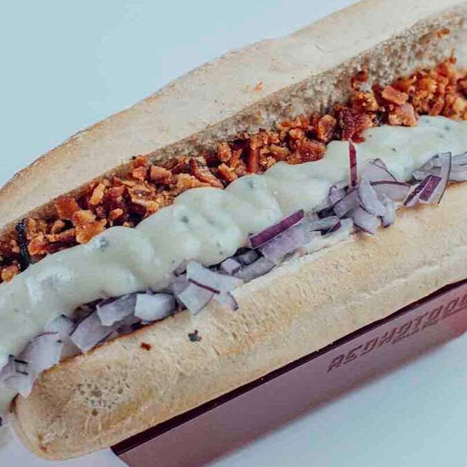 Pao De Hot Dog, Salsicha 100% Bovina, Maionese Da Casa, Creme De Gorgonzola, Cebola Roxa Fatiada, Bacon Crocante.