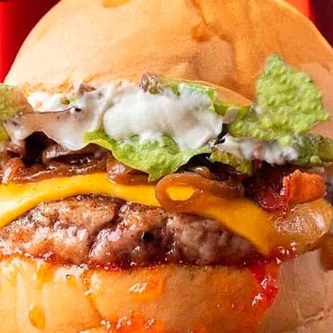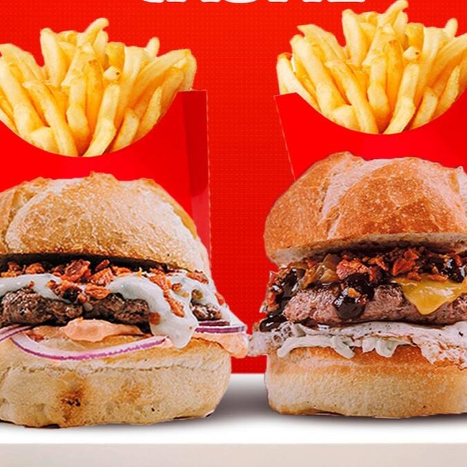 Um hambúrguer artesanal de 160gr + um smash fininho de 100gr no precinho, só aqui no Red Hot.