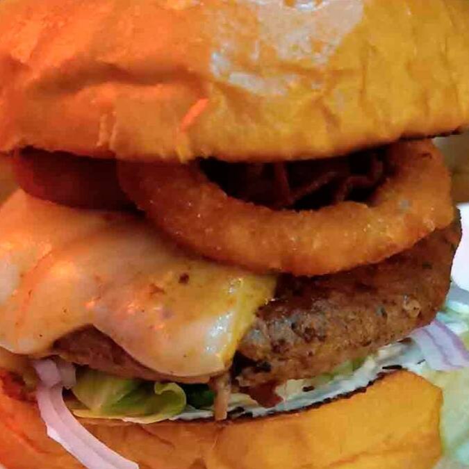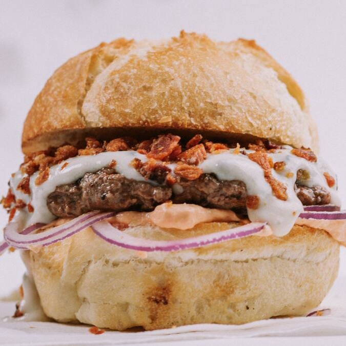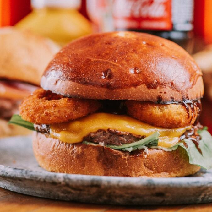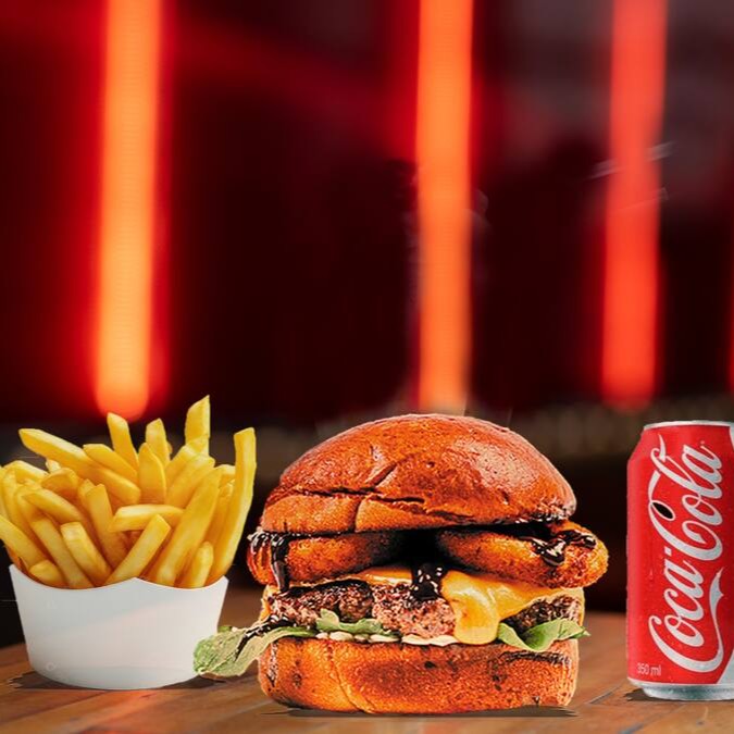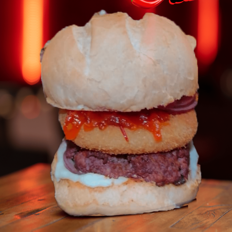 Pão brioche, suculento Hamburger Artesanal de 160gr, rucula, cheddar cremoso, onion rings, molho barbecue, maionese da casa.