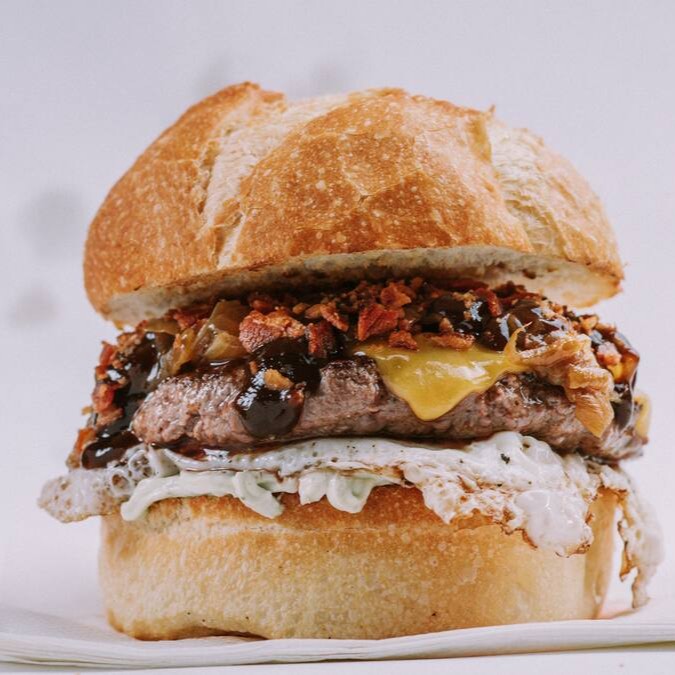 Pão francês bola, suculento Hambúrguer Artesanal de 160gr, maionese, molho barbecue, cebola caramelizada, bacon crocante, ovo frito.