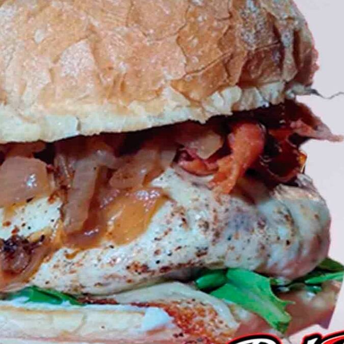 Pão francês bola, hamburguer artesanal de 160gr, maionese da casa, queijo provolone, cebola roxa, geleia de bacon.