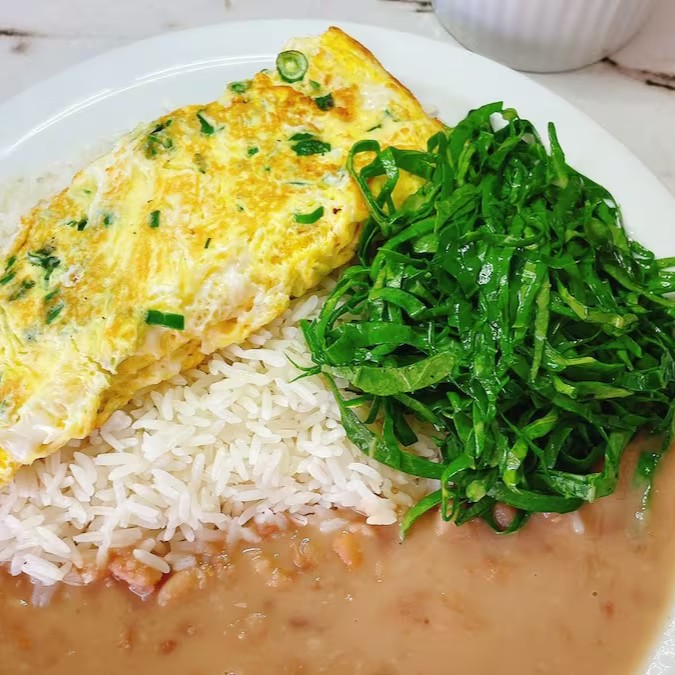 Imagem ilustrativa; Omelete fofinha e bem temperada, acompanhada de arroz, feijão, quibebe de abóbora, batata frita e salada fresca. Leve, equilibrada e deliciosa.