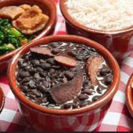Feijoada, arroz branco, farofa. couve, banana à milanesa, torresmo, vinagrete.