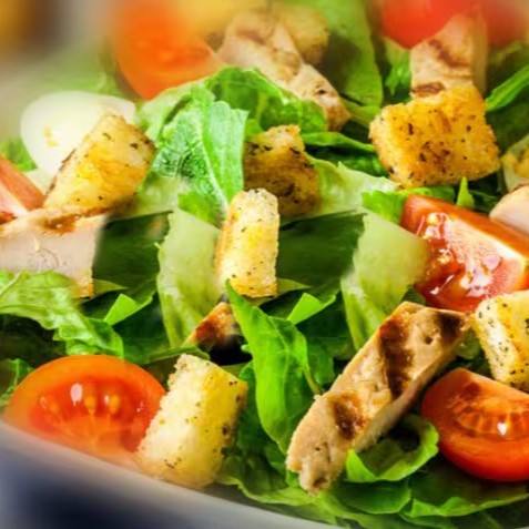 Salada completa com frango em tiras e cubos de tomate cereja.Olha que demais..