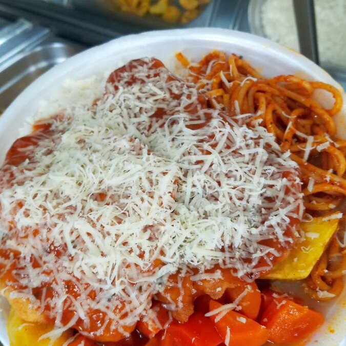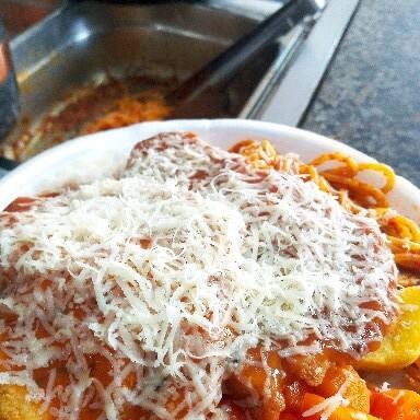 Prato delicioso do dia com 2 tilapias a parmegiana (Almoço delicioso para quem gosta de tilapia )vai com 2 pedaços de tilapia .Almoço completo