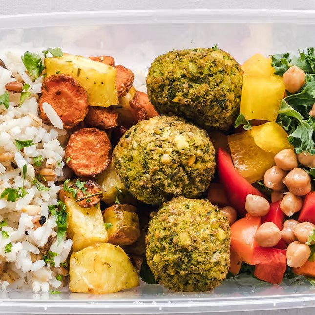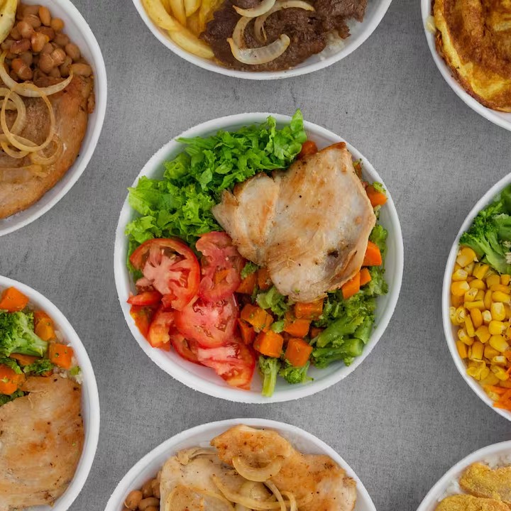 Legumes salada e Proteina a sua escolha .Uma marmita montada no capricho proporcionando uma alimentação balanceada com feijão ,arroz entre varios ingredientes para sua alimentação.