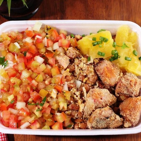 acompanha com carne Peixe+Torresmo e ovo frito deliciosamente para seu almoço completo