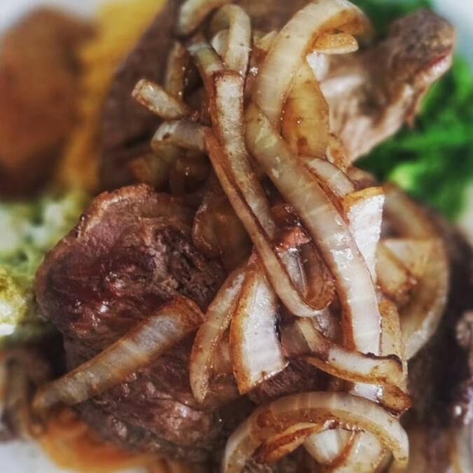 Uma cebolinha não pode faltar no nosso bife, por isso nunca deixaríamos essa delícia fora...acompanha arroz branco ,batata frita e salada com uma sobremesa de quebra..