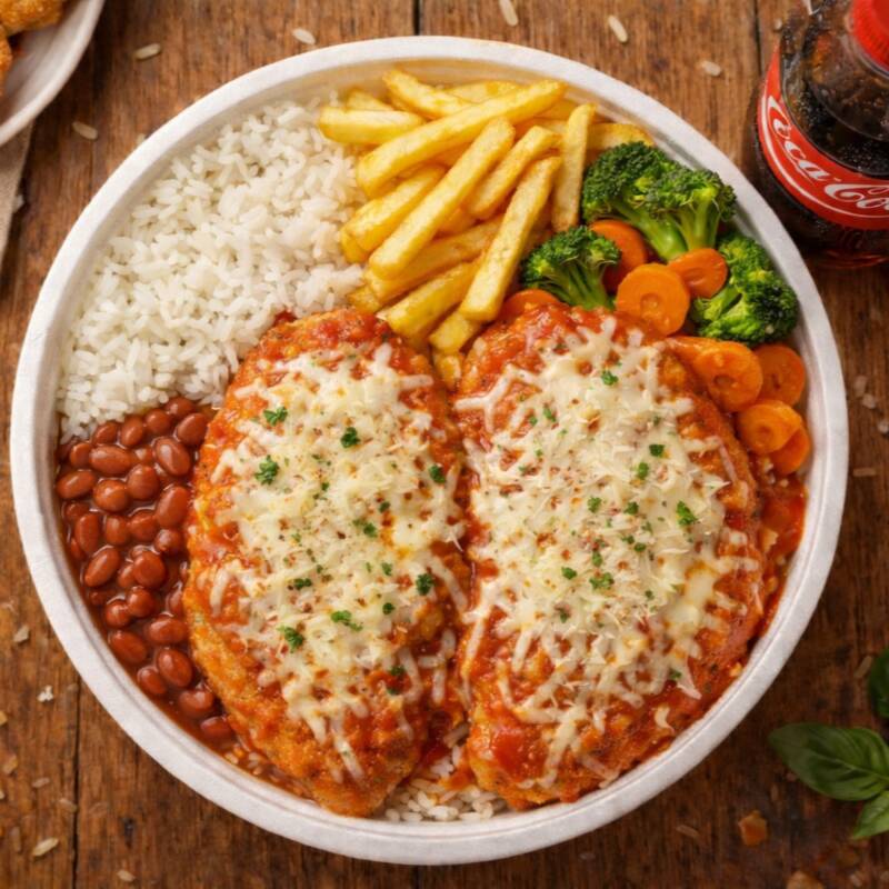 Combo Rei Absoluto 2 Parmegianas de Frango no prato + Torresmo + Coca + Doce Pastoso 650ml Uma refeição completa, gigante e irresistível. São 2 parmegianas de frango bem servidas, com molho vermelho e queijo, acompanhadas de arroz soltinho, batata frita crocante e salada fresca.