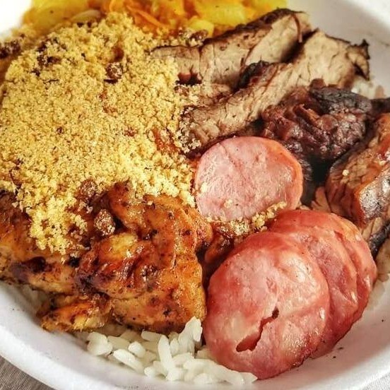 Carne de vaca, carne de porco e linguiça assadas no carvão, acompanhadas de arroz, feijão, batata frita, farofa e saladinha de maionese.