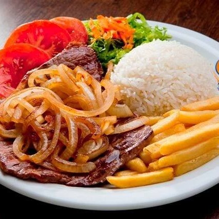 (Foto ilustrativa) Bife de patinho acebolado, arroz, feijão, farofa da casa e batata frita.