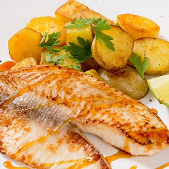 (Foto ilustrativa) Filé de tilápia grelhada, arroz, feijão, banana a milanesa e batata rústica.