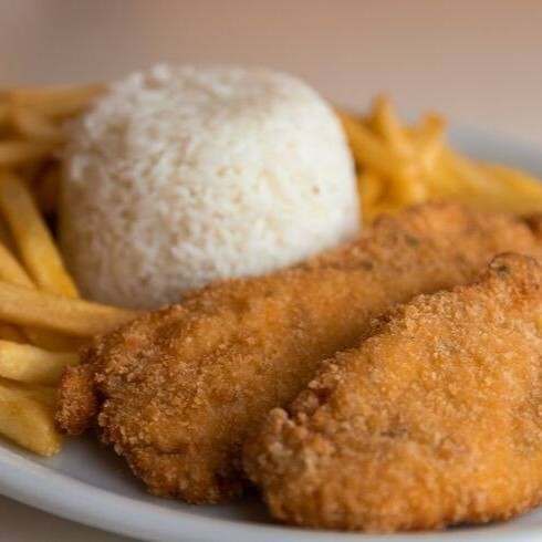 (Foto ilustrativa) Filé de tilápia empanado e frito, arroz ,molho de tomate, queijo mussarela e batata frita.