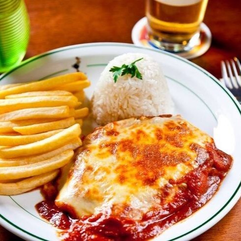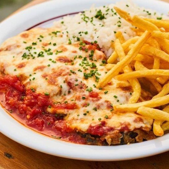 (Foto ilustrativa) Filé de frango empanado e frito, molho de tomate, mussarela, arroz e batata frita.