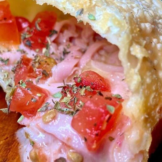 (Foto ilustrativa) Massa de pastel, presunto, mussarela , tomate e orégano.