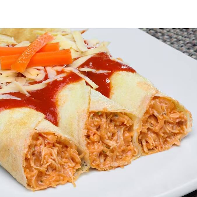 (Foto ilustrativa) Massa de panqueca, strogonoff de frango, Catupiry ou cheddar e molho de tomate Arroz,feijão,Salada,Batata frita.