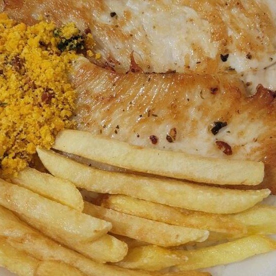 (Foto ilustrativa) File de tilápia empanado e frito, arroz, feijão e batata frita.