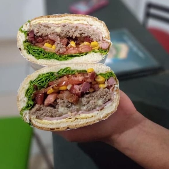 Pão de hambúrguer, hambúrguer caseiro, presunto, queijo, bacon, ovo, alface, tomate e milho.