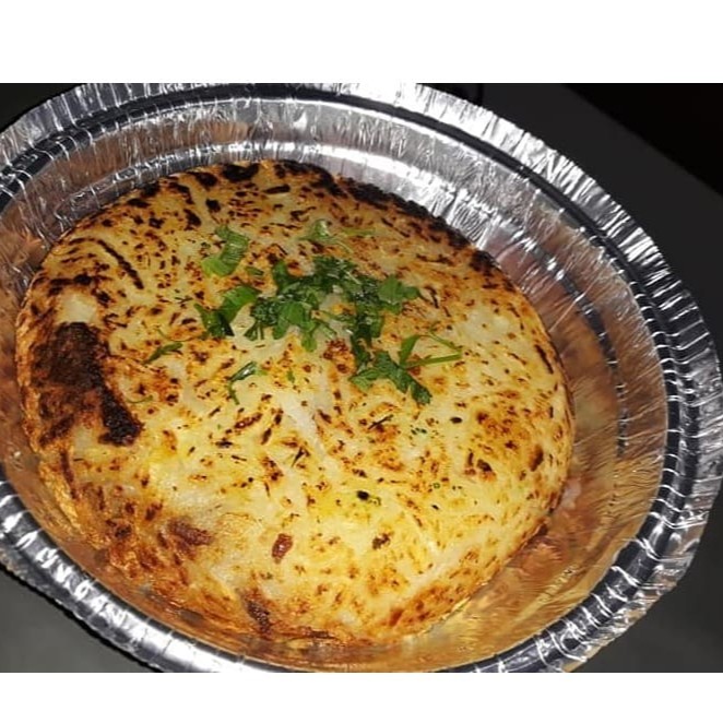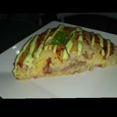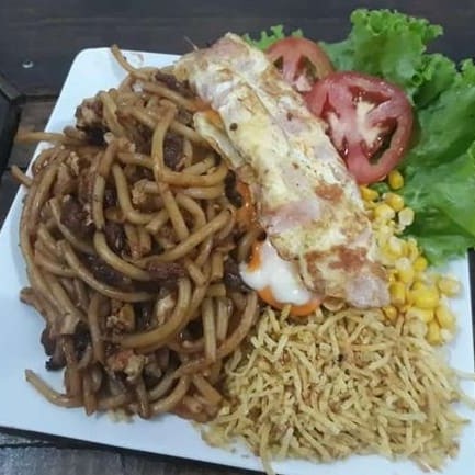 Macarrão, frango, bacon, molho de tomate, shoyo, 1 omelete, presunto, queijo, Catupiry, cheddar, alface, tomate, milho e batata palha.
