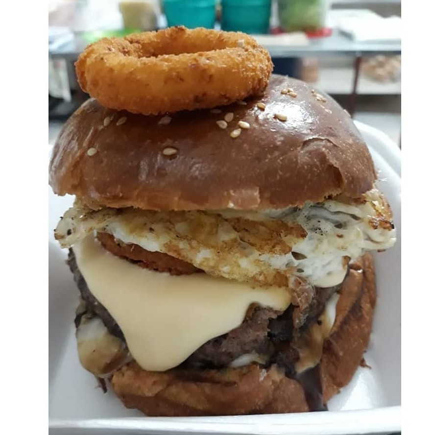 Pão Brioche, hambúrguer, 130g de queijo prato, bacon, Catupiry, ovo, barbecue e onion rings.