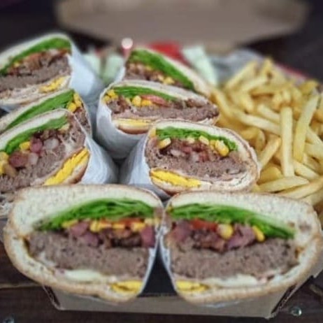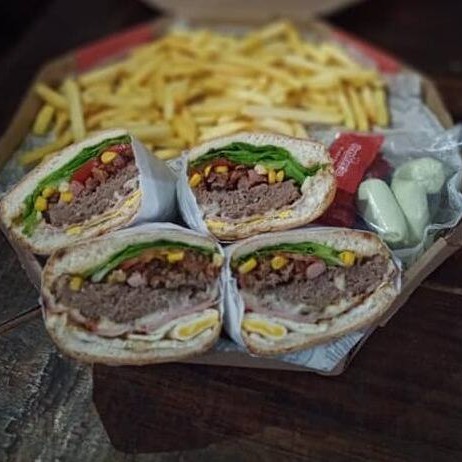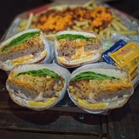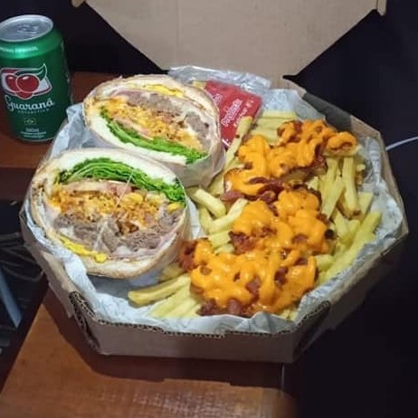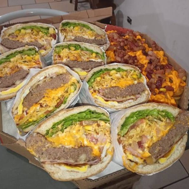 2 moda grande (pão de hambúrguer, 2 hambúrguer caseiro, presunto, queijo, bacon, ovo, Catupiry, cheddar, alface, tomate,milho e batata palha.) 1 batata G (500g) com bacon e cheddar 1 gebel (2 litros)