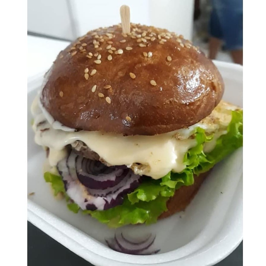 Pão Brioche, hambúrguer, 130g de queijo prato, ovo, cebola roxa, alface e tomate.