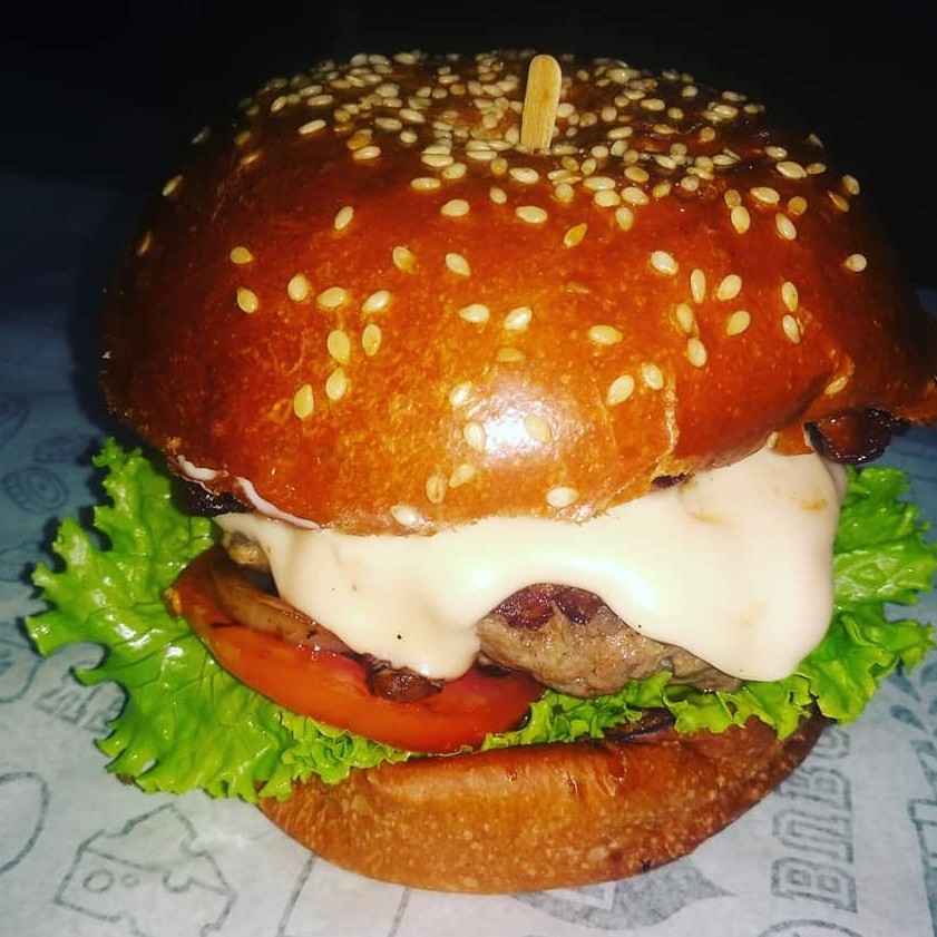 Pão Brioche, hambúrguer, 130g de queijo prato, bacon, alface, tomate e cebola caramelizada.