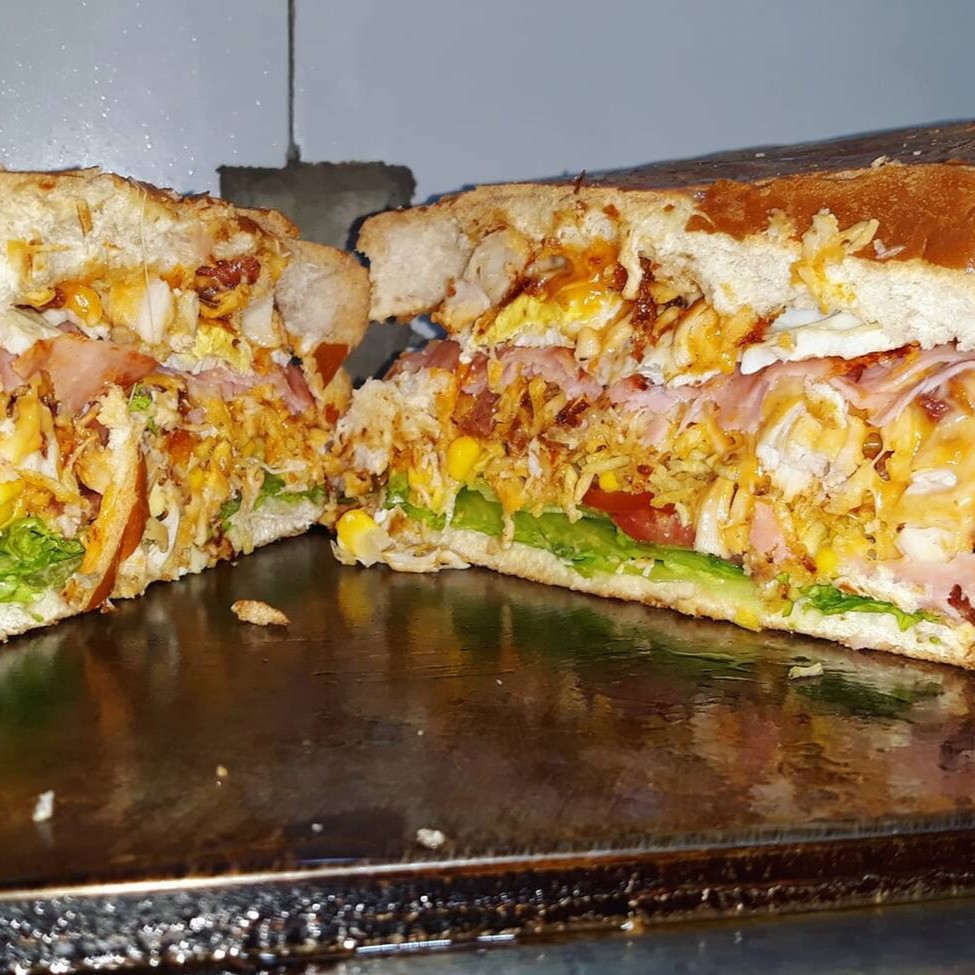 Pão francês, contra-filé, presunto, queijo, ovo, alface, tomate, milho e cebola frita.