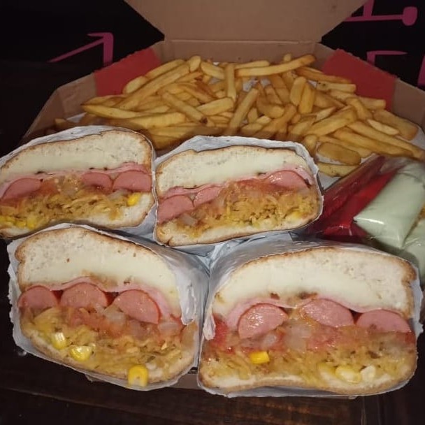 1 cachorrão (pão de hambúrguer, 3 salsichas, presunto, queijo, purê, batata palha, milho e vinagrete. Batata frita (500g) 1 gebel (2 litros)