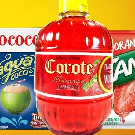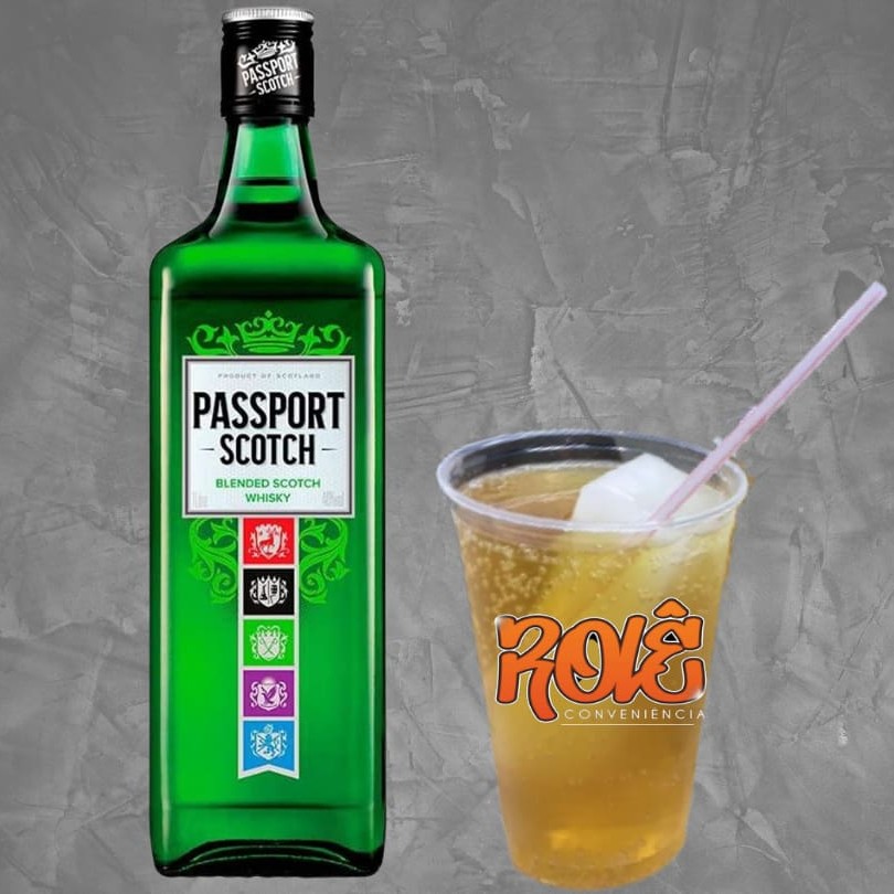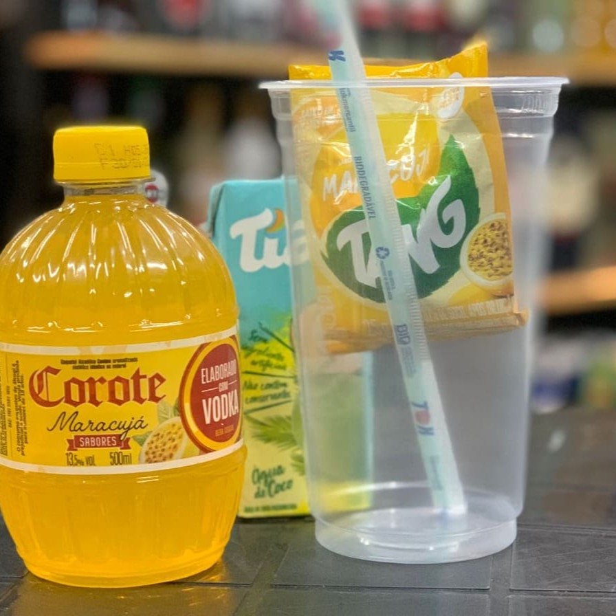 Corote de maracujá, suco (Tang ou mid) de maracujá, gelo de água de coco saborizado de maracujá, copo 770ml e canudo.