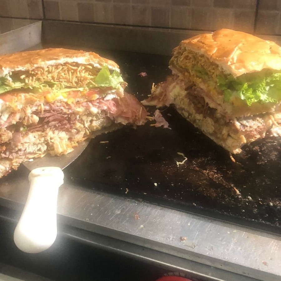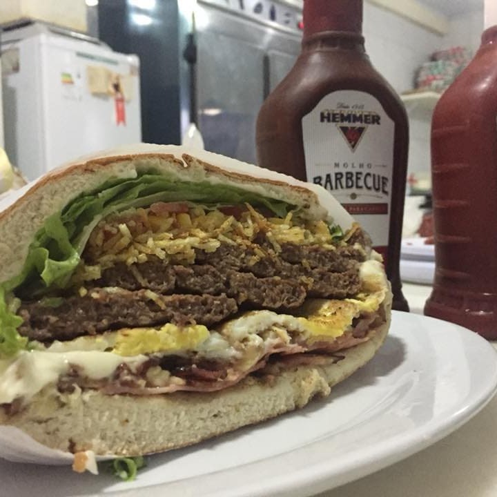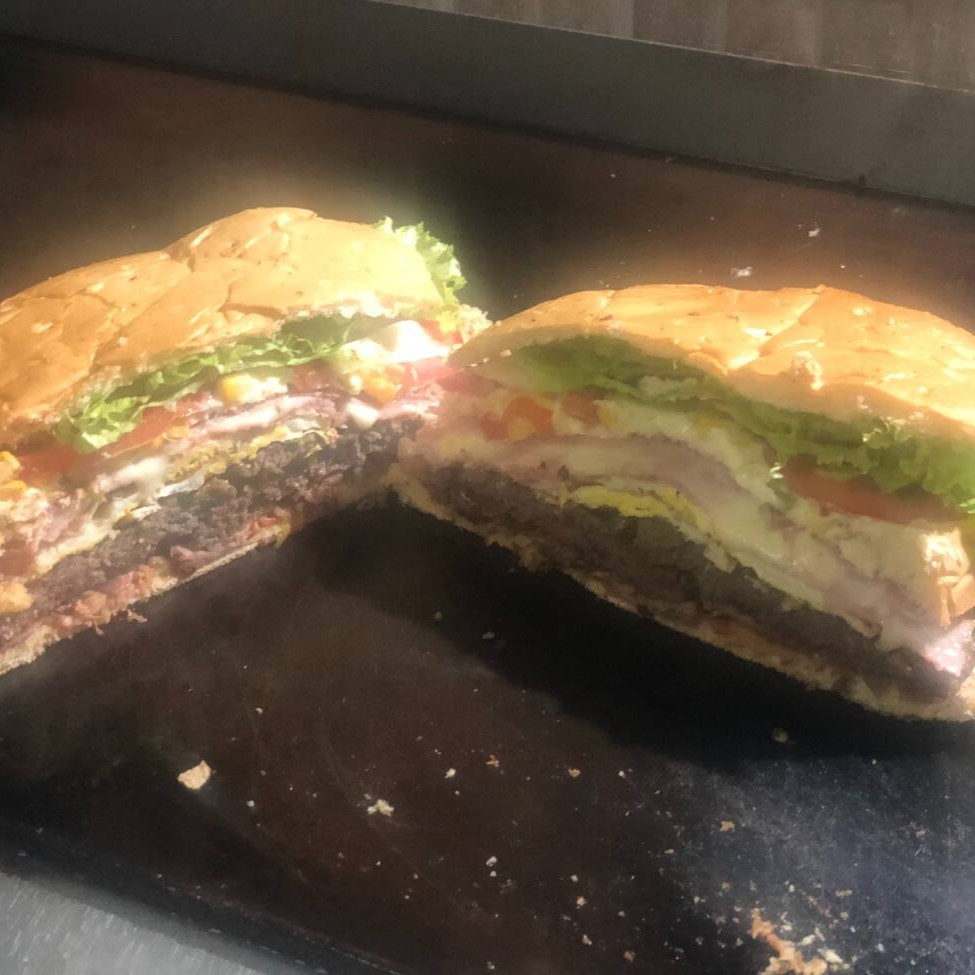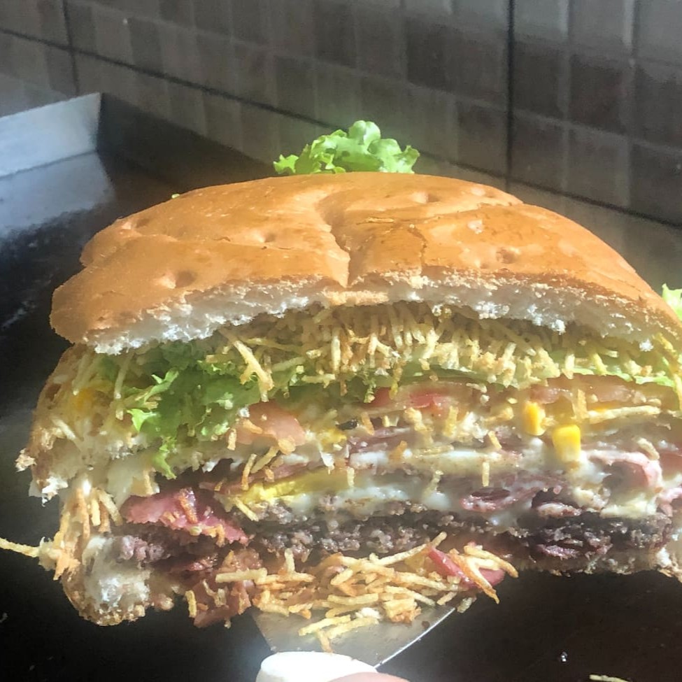 Hambúrguer, calabresa, queijo, presunto, ovo, bacon, alface, tomate e milho.