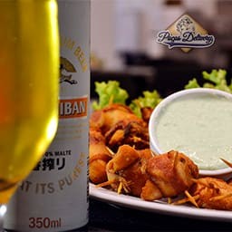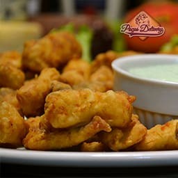 Batatas fritas com cheddar, 12 onion rings, chicken katsu (filezinho de frango empanados), pimenta biquinho e picles.
