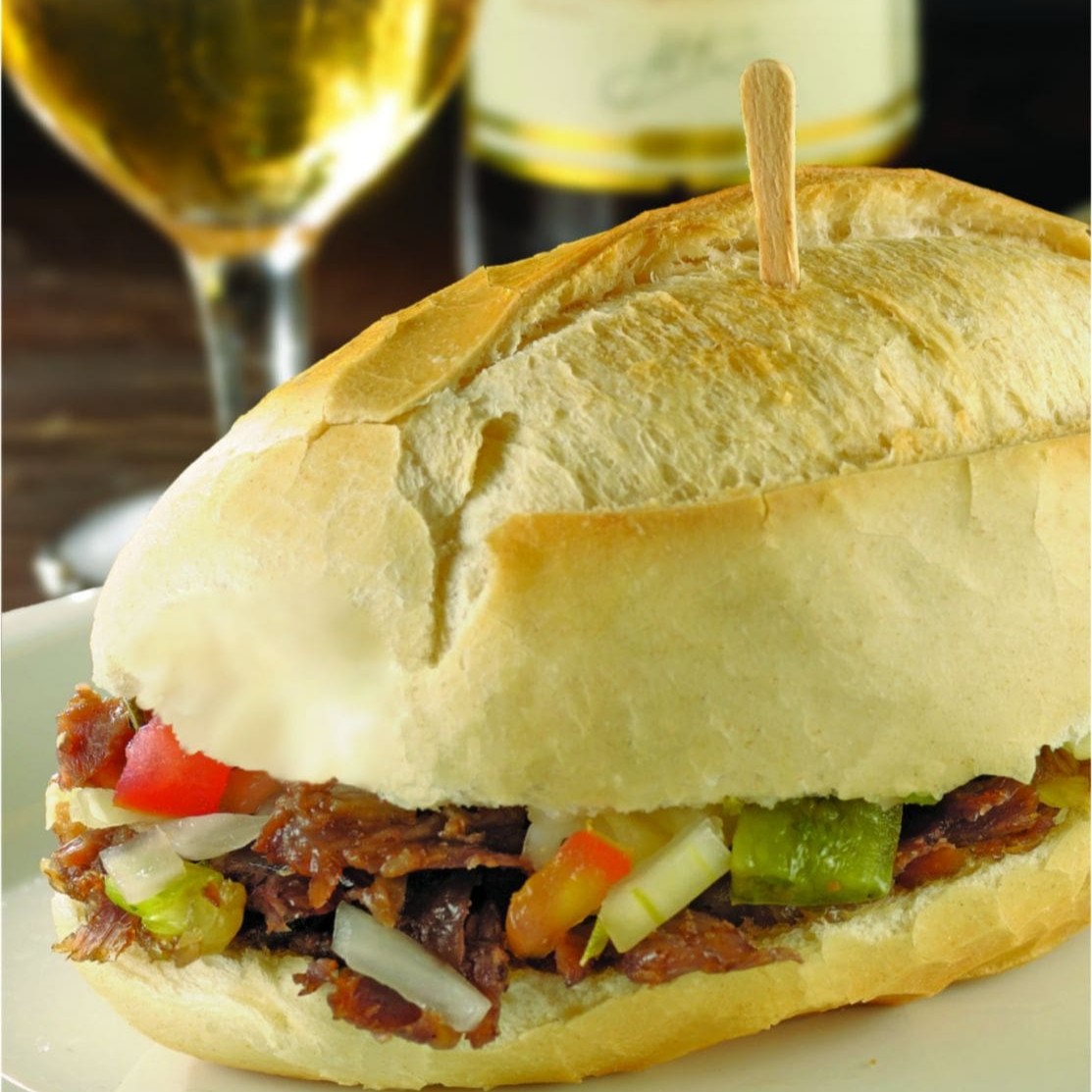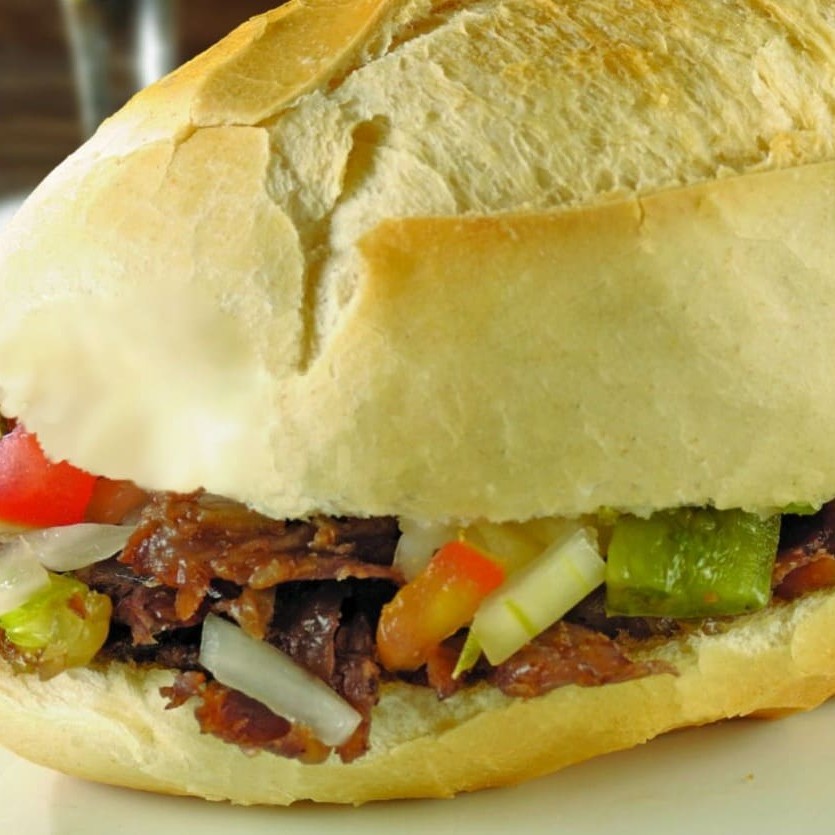 Pão francês, costela assada durante 12 horas (smoking grill) desfiada, vinagrete (tomate, cebola e pimentão), creme suave à base de gorgonzola. Acompanha onion rings