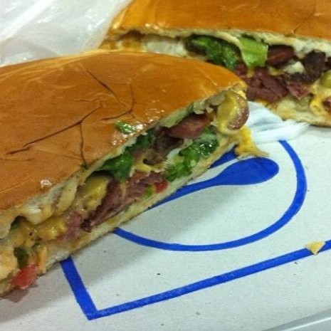 Contra filet, calabresa, bacon, queijo, presunto, 2 ovos, Catupiry, alface, tomate, milho e batata palha.