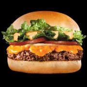 Hambúrguer, queijo cheddar, bacon e tomate.