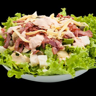 Alface, tomate, azeitonas, presunto, mussarela, cebola, palmito, ovos, cenoura ralada, bacon em fatias.