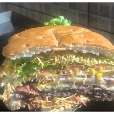 3 hambúrgueres artesanais de 120gr cada, calabresa, queijo, presunto, 2 ovos, bacon, alface, tomate, milho, batata palha e Catupiry.