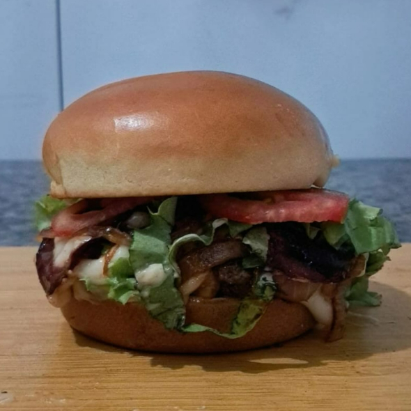 Pão brioche smash amanteigado, hamburguer artesanal (150g) cheddar derretido, bacon fatiado,3 unidades onion rings, cebola caramelizada. (acompanha molho da casa)