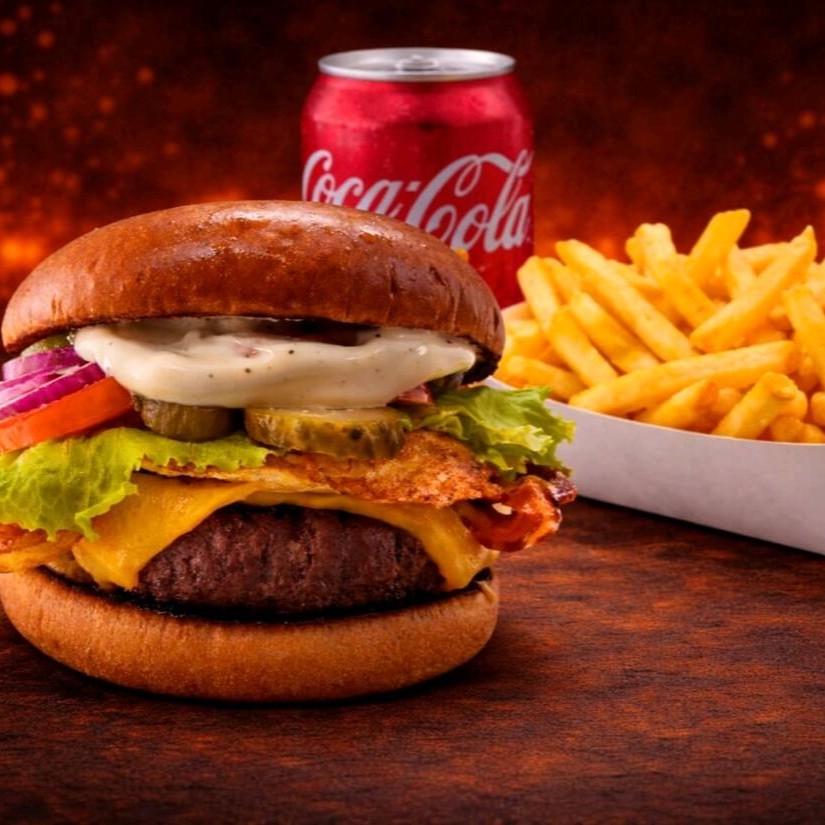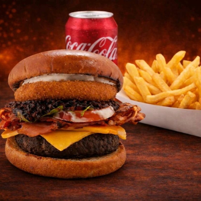 O combo mais intenso e irresistível da casa. Burger Angus 200g com bacon no mel, disco de queijo empanado, cebola caramelizada e salada fresca no pão brioche macio. Acompanha fritas crocantes (200g) e refrigerante lata 350ml.
