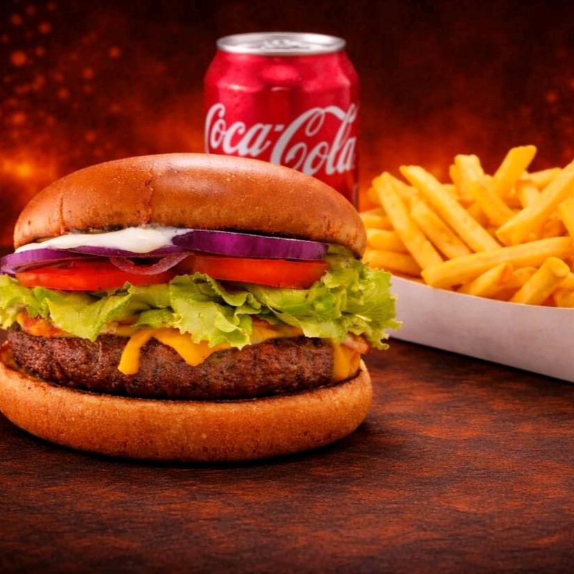 Uma combinação fresca e completa. Burger Angus suculento de 200g com alface, tomate e cebola roxa no pão brioche macio, acompanhado de fritas crocantes (200g) e refrigerante lata 350ml.