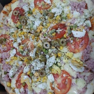 Molho de Tomate, Calabresa, Mussarela, Cebola, Pimenta calabresa,Azeitona e Orégano.