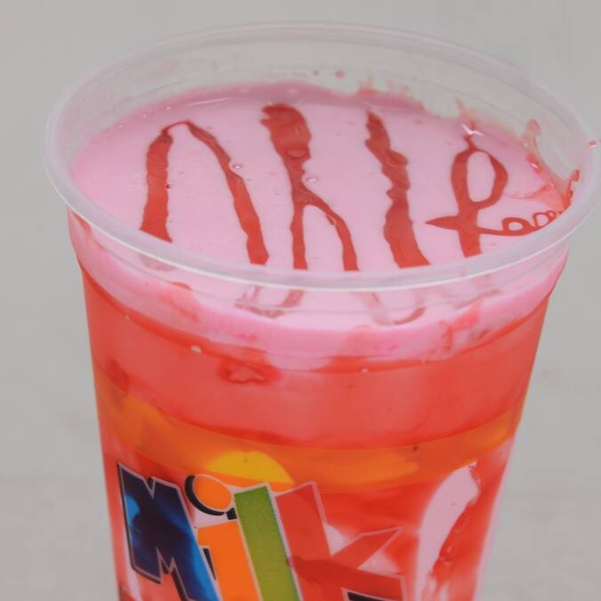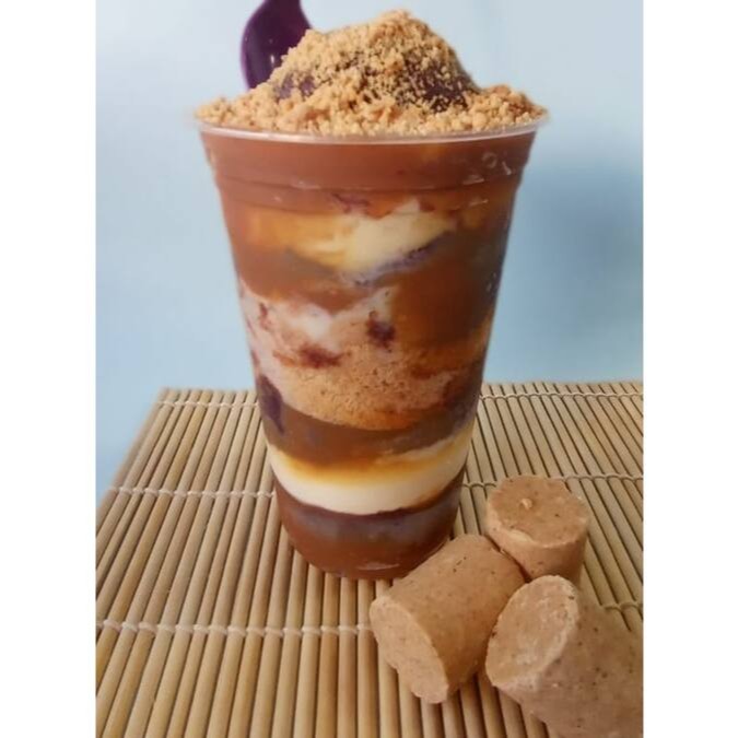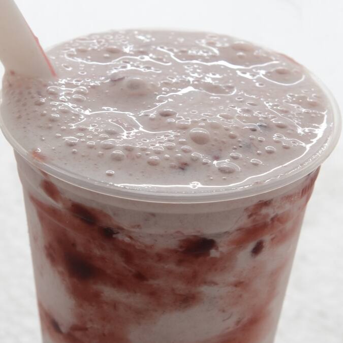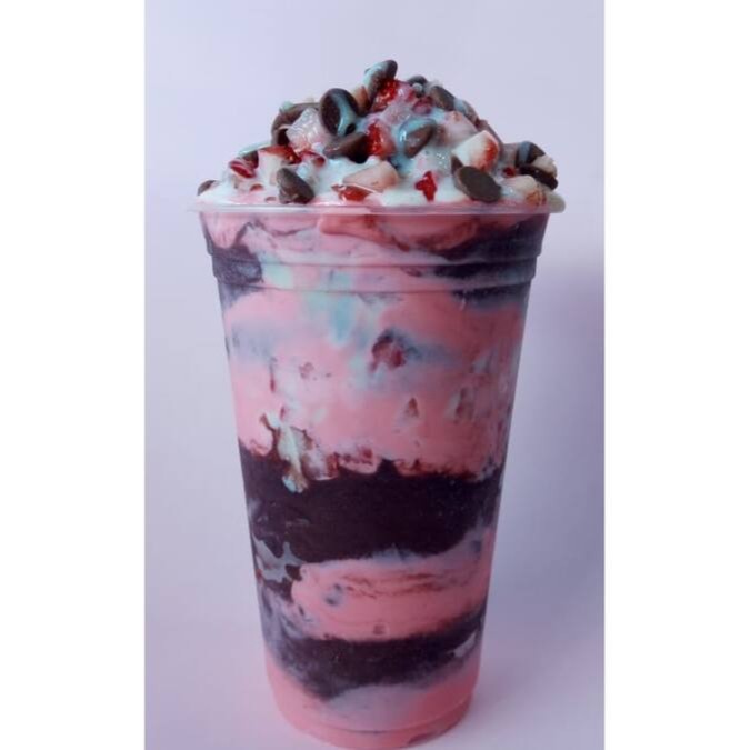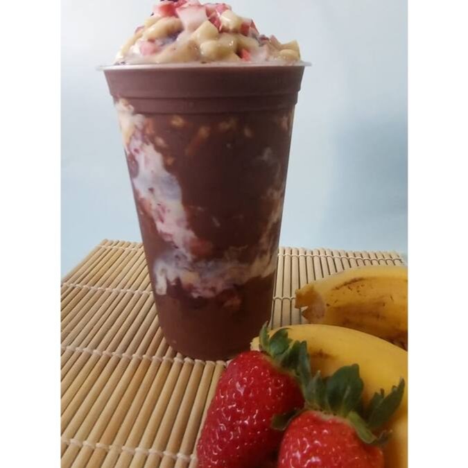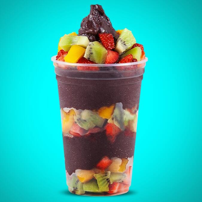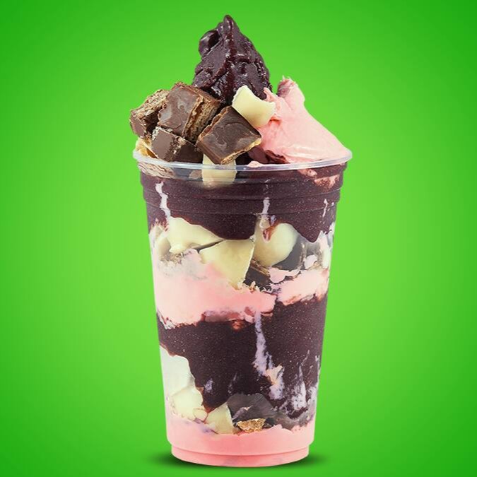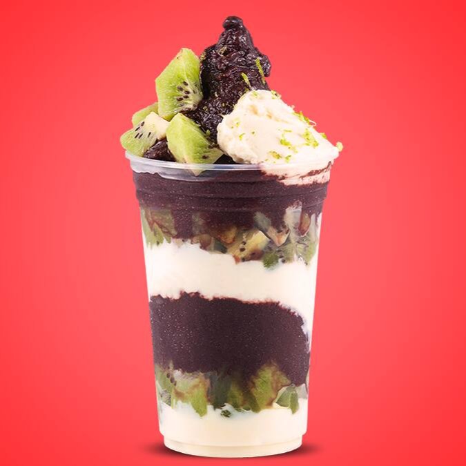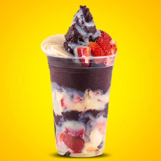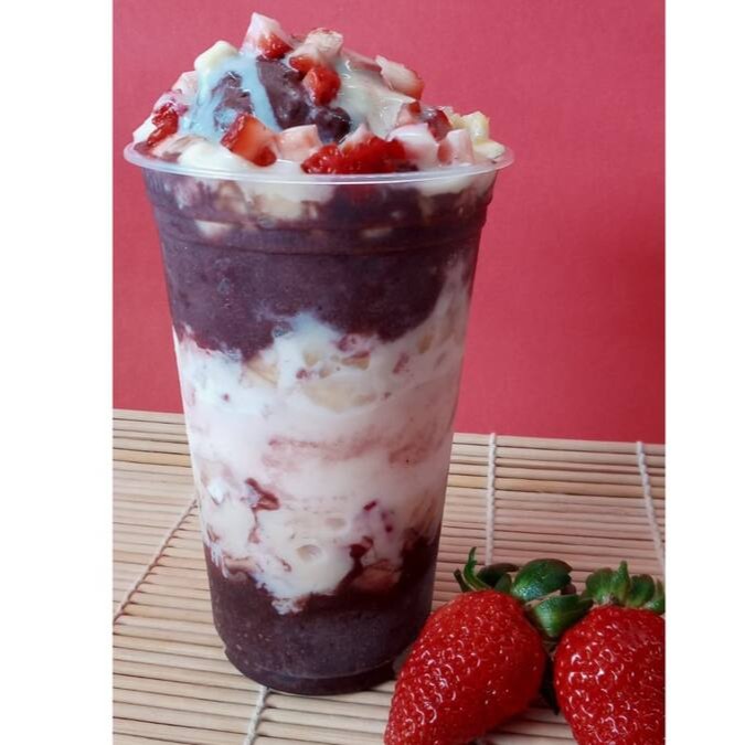 Copo de 500ml com camadas intercaladas de Açaí e Cupuaçu, banana, morango e leite condensado