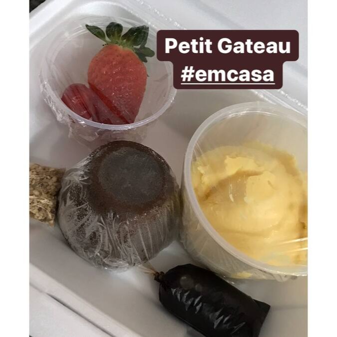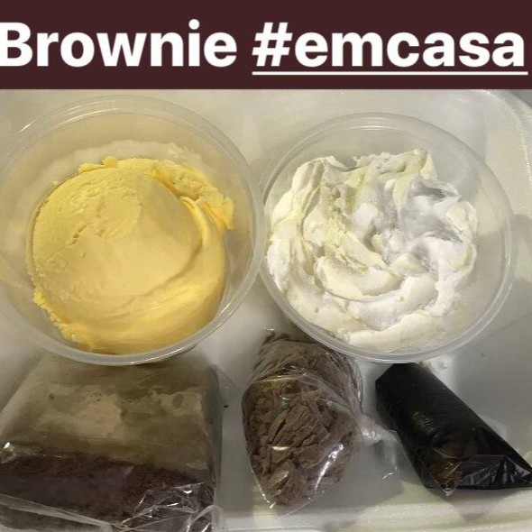 Bolinho de Chocolate com Nozes, sorvete de creme, cobertura de chocolate, chantilly e raspas de chocolate.