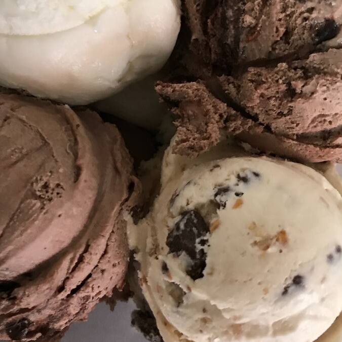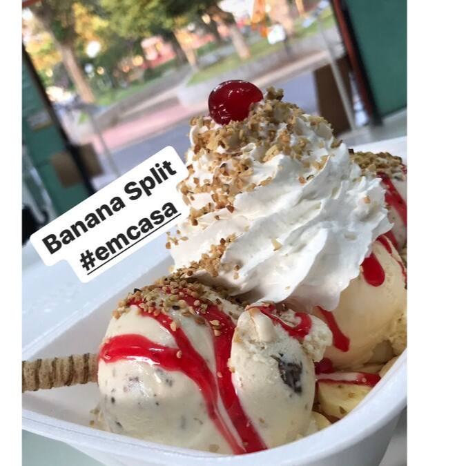 3 bolas de Sorvete, banana, coberturas, castanhas, chantilly, waffle e cereja.